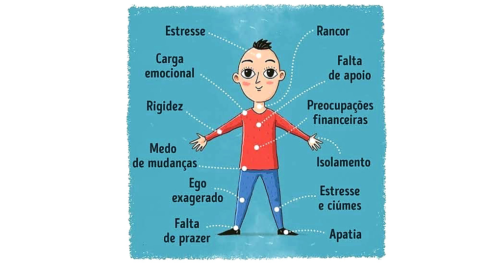 E para a nossa sorte, muitos estudiosos pesquisaram o local onde a enfermidade se instala e identificaram um padrão que a relaciona com determinados sentimentos ou certas dificuldades emocionais. Veja alguns exemplos: